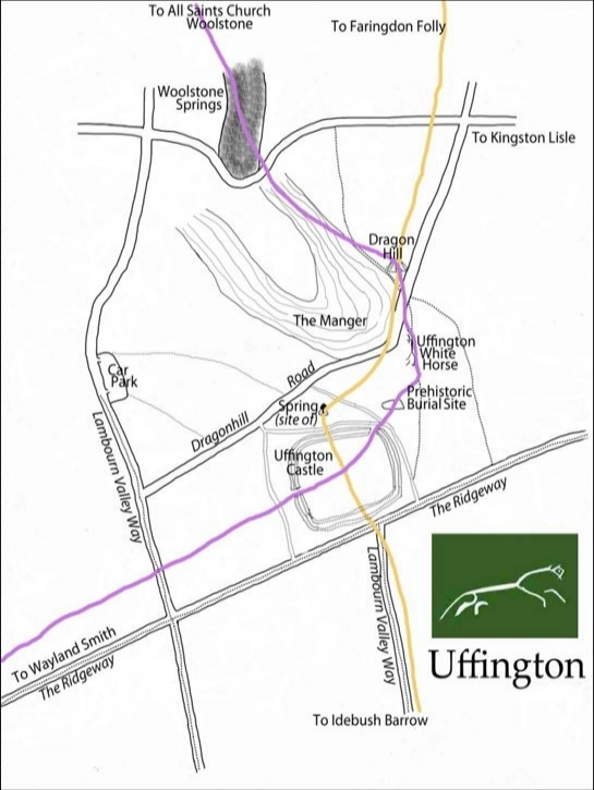 The Uffington prehistoric area in Oxfordshire consists of the oldest chalk-cut figure of a horse, which many researchers agree is a stylised Dragon, Dragon Hill, where legend says St George slays a Dragon, Uffington Castle a large Iron Age Hillfort and Wayland Smithy, a Neolithic chambered long barrow. Our research indicates that this whole complex was an important ceremonial place of the dead constructed over the centuries by an ancient tribe, now long forgotten, who worshipped the northern stars. The Michael and Mary dragon lines target the Uffington Complex but as they approach they swerve around it, the female passing just to the north and the male to the south. Millar and Broadhurst believe this behaviour was not to avoid the sacred site but to encompass it. The Belinus and Elen currents cross twice here highlighting the importance of this enigmatic site on the prehistoric Ridgeway.